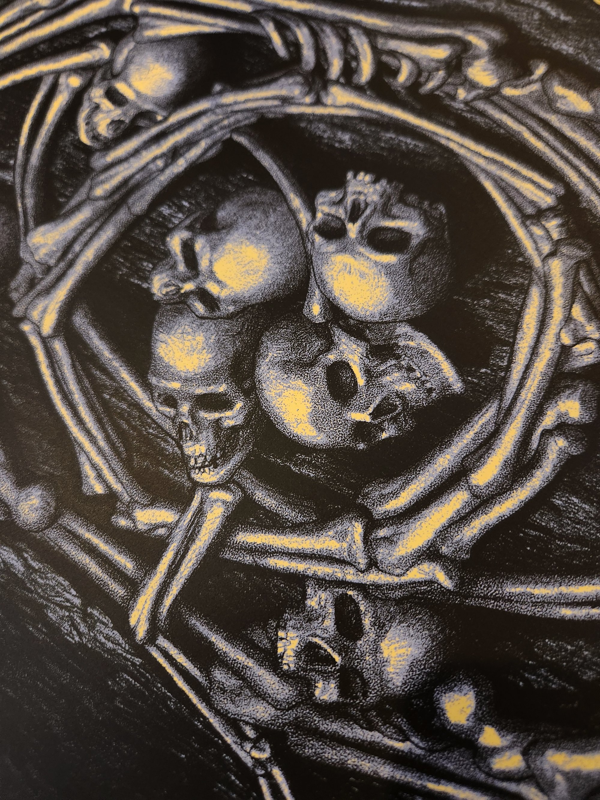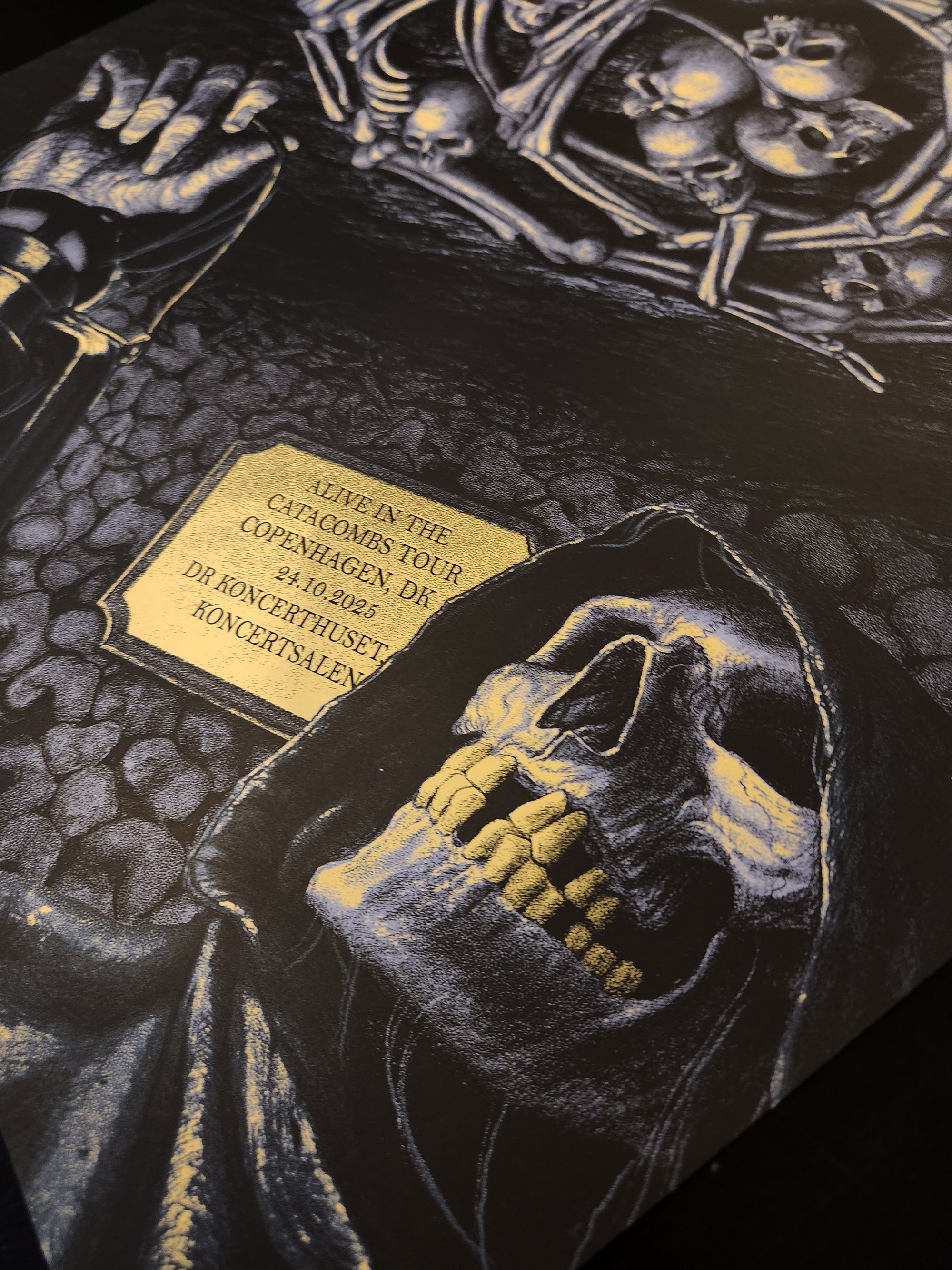 Screen-printed poster for the Alive in the Catacombs Tour 2025. Copenhagen, DK. 24. 10. 2025. Dr Koncerthuset, Koncertsalen.